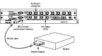 Step 3 Plug the RJ-45 connector at the other end of the EIA/TIA-232 cable into the RJ-45-to-DB-25 male adapter labelled "Modem."