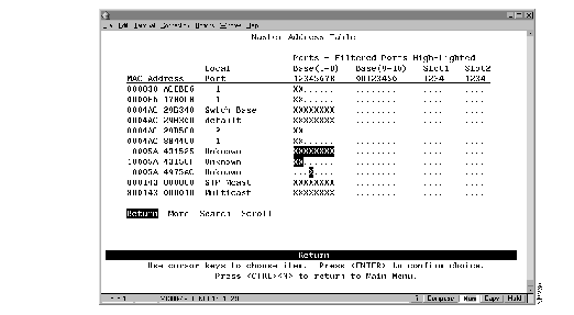 To view all entries in the master address table, select Master Address Tables on the Status/Statistics Menu. The Master Address Table panel (Figure 7-5) is displayed. The master address table can contain up to 10,000 entries.