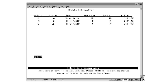 To view general information about the Catalyst 2600 and any UFCs installed, select Module Information on the Status/Statistics Menu. The Module Information panel (Figure 7-2) is displayed.