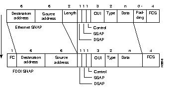 An Ethernet SNAP frame is translated into an FDDI SNAP frame as shown in Figure C-6. When an Ethernet SNAP frame is received, the FC field is added, and the Length field is stripped. Any padding in the Ethernet Data field is dropped.