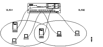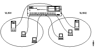 The Catalyst 2800 supports overlapping VLANs so resources can be shared between logical workgroups. Figure 3-2 shows two VLANs, VLAN1 and VLAN2, sharing a server connected to port F1. Stations in both VLAN1 and VLAN2 can access the server, but otherwise they are completely isolated from each other.