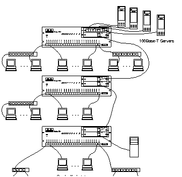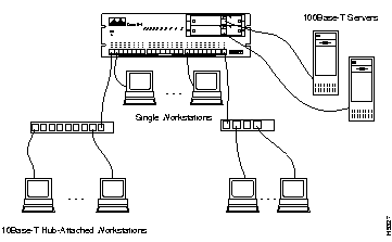 The Catalyst 2800 supports twenty-five switched Ethernet connections for single workstations or 10Base-T hubs. Two 100Base-TX/1 modules can be installed for connecting to servers.