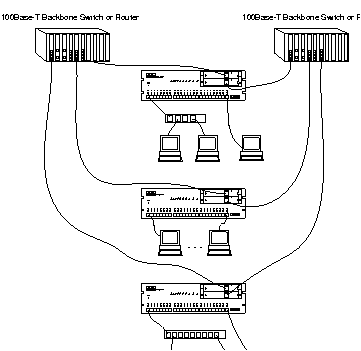 Catalyst 2800s can connect to a 100Base-T backbone switch or router in a redundant backbone configuration using the Spanning-Tree Protocol. With support for CollisionFree operation, each 100Base-T link supports up to 200 Mbps of bandwidth and fiber cabling distances of up to 2 km.