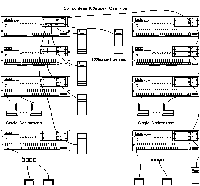 Multiple Catalyst 2800s using single-port Catalyst 2800 100Base-T modules can be daisy-chained via CollisionFree 100Base-T for up to 200 Mbps bandwidth between switches. Additional high-speed ports using single or multiport Catalyst 2800 repeater modules can be used to connect to 100Base-T servers or other devices.