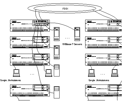 A Catalyst 2800 with a Catalyst 2800 100Base-T module can provide a local 100Base-T backbone to other Catalyst 2800s and servers and, with a single Catalyst 2800 FDDI module, provide FDDI backbone connectivity. Catalyst 2800 FDDI modules support UTP single attachment station (SAS), fiber SAS, and fiber dual attachment station (DAS) configurations for connecting to servers, routers, concentrators, or direct ring attachment.