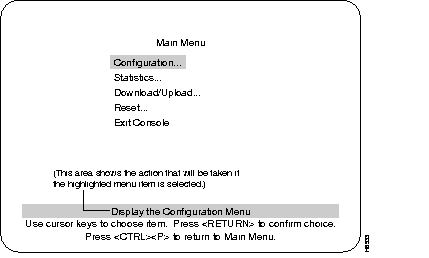 Displays the Configuration menu, which enables you to view and set the Catalyst 3200 configuration parameters. The Configuration section and its sub-menus are described in Chapter 7, "Console Configuration."