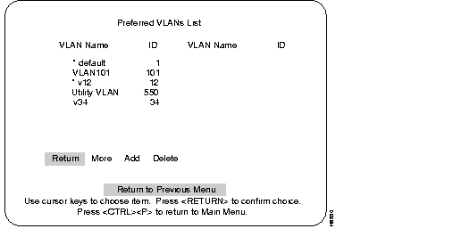 The following menu, VTP VLAN Configuration, is accessed from the VLAN and VTP Configuration menu. When the switch is in the Server mode, the menu displayed below is presented. The line after the VLAN Name parameters will read "Return More Change... Add... Delete."