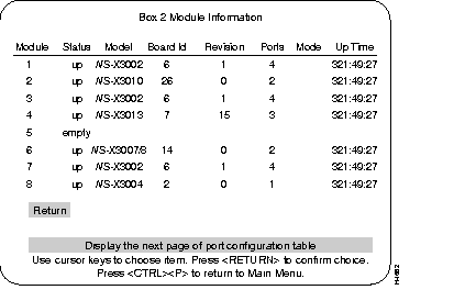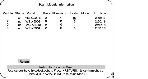 Step 1 From the Configuration menu, select the Module Information sub-menu and press RETURN. The Module Information screen is displayed. Verify that "WS-X3006A" is displayed and that the status fields associated with it are similar to the following example screen (except for revision level).