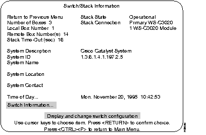Use the Switch/Stack Information screen to view system information and to view or change the system name, location, contact, and time of day. To add or change the system name, location, contact or time of day, use the arrow keys to move the highlight to the selection and press the RETURN key. A prompt appears near the bottom of the screen for entering text for that selection. Pressing RETURN again enters that text.