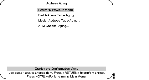 The ATM Channel Aging menu is used to age out less frequently used ATM channels. The concept of address aging and management is described in the Address Aging section. This menu is accessed from the Address Aging menu. At the Address Aging menu, select ATM Channel Aging and press RETURN.
