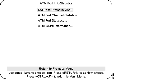 The ATM Port Info/Statistics menu is used to access ATM Statistics and Board information menus. Access this menu from the Statistics menu.