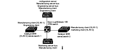 In a single emulated LAN configuration, the LANE components might be assigned to a particular department in a company. The Manufacturing department is used for the following scenario: