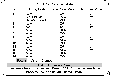 This mode is set to either on or off. If set to on, an incomplete packet (less than 64 bytes) will be discarded, and a runt packet error is logged and displayed under the Statistics menus. If set to off, runt packets will be forwarded through the switch.