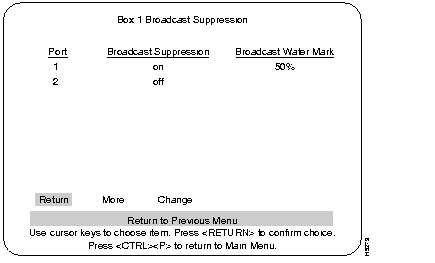 As the name implies, this feature is to suppress broadcast packets. This function is set on a per-port basis at the Broadcast Suppression screen. If set to on (enable), that port is set to a percentage threshold level (Broadcast Water Mark) at which broadcast packets are suppressed (percentage is based on total traffic). If the broadcast level on a specific port exceeds the set threshold, all broadcasts originating from that port are blocked until the broadcast level drops below that mark.