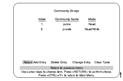 Community String Table entries are saved when you select Return to Previous Menu. Entries are preserved across resets and power cycles.
