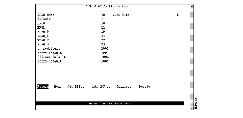 To configure VLANs and the VTP for the Catalyst 3900, select VLAN and VTP Configuration on the Configuration Menu. The VLAN and VTP Configuration panel (Figure 5-5) is displayed.