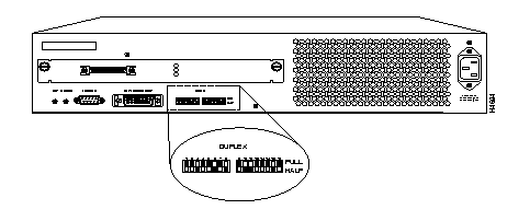 On Enhanced models, 10BaseT ports on the Catalyst 3000 can be set to either Half-Duplex or Full-Duplex communication mode by the use of DIP switches on the back panel (see Figure 5-14) If the enhanced feature is not configured, then only half-duplex can be used. The enhanced feature must be set and verified through the console. See Chapter 7, "Console Configuration."