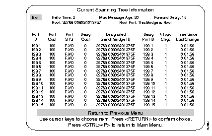 Select Yes or No by moving highlight to heading, pressing RETURN, move highlight to Yes or No and press RETURN. If you select No, the remaining values on the menu will be saved, but will have no effect. Selecting Yes will enable spanning tree upon exiting this screen.