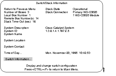 Use the Switch/Stack Information screen to view system information and to view or change the system name, location, contact, and time of day. To add or change the system name, location, contact or time of day, use the arrow keys to move the highlight to the selection and press the RETURN key. A prompt appears near the bottom of the screen for entering text for that selection. Pressing RETURN again enters that text.