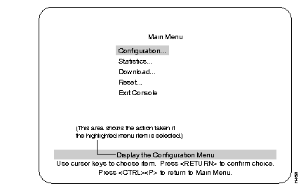 Displays the Configuration menu, which enables you to view and set the Catalyst 3000 configuration parameters. The Configuration section and its sub-menus are described later in this chapter.