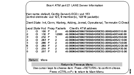 Selecting LES Info at the LANE Server/BUS Configuration menu takes you to the LANE Server Information menu. This menu displays the active LANE Clients connected to the LES.