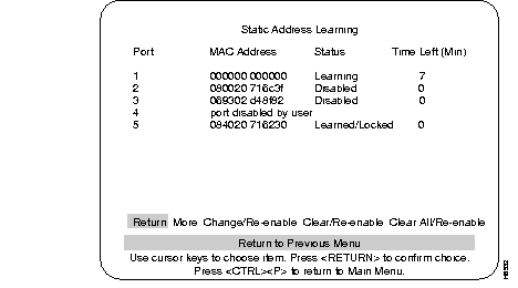 Step 5 Return to the Learn and Lock menu and select the heading Static Address Learning. In the following Static Address Learning menu example:
