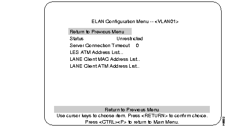 Selecting ELAN's Info at the LANE Server/BUS Configuration menu takes you to the LANE BUS Information menu. This menu lists the ELAN name, LES address, and the number of LANE Clients that are operational on each ELAN.
