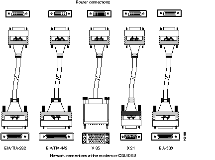 The synchronous serial port supports the following signaling standards: EIA/TIA-232, EIA/TIA-449, V.35, X.21, and EIA-530. You can order a DB-60 shielded serial transition cable that has the appropriate connector for the standard you specify. The router end of the shielded serial transition cable has a DB-60 connector, which connects to the serial port on the router card. The other end of the serial transition cable is available with the connector appropriate for the standard you specify. The documentation for the device you want to connect should indicate the standard used for that device. The synchronous serial port can be configured as DTE or DCE (except EIA-530, which is DTE only), depending on the attached cable.