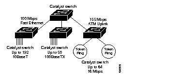 The Catalyst 5000 series switch provides high-density switched Ethernet and Fast Ethernet for both wiring closet and data center applications. The switch includes a single, integrated 1.2-Gbps switching backplane that supports switched Ethernet with repeater connections, Fast Ethernet with backbone connections, Fiber Distributed Data Interface (FDDI), Copper Distributed Data Interface (CDDI), Asynchronous Transfer Mode (ATM), and 4- and 16- Mbps Token Ring. The Catalyst 5000 provides switched connections to individual workstations, servers, LAN segments, backbones, or other Catalyst 5000 switches using shielded twisted-pair (STP), unshielded twisted-pair (UTP), and fiber-optic cable. Figure 1 is an example of a configuration using the Catalyst 5000 series switch.