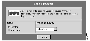 Use the Process Status, Start Process, and Stop Process features in the Resource Manager interface to view process status and troubleshoot process problems. Use the command-line interface for processes that cannot be monitored with the Resource Manager interface (for example, syslogd).