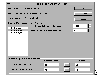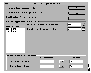 Use the Cisco Hub/Ring Manager Application Setup dialog box to change parameters that control LAN polling mechanisms and timeouts for Cisco Hub/Ring Manager applications on the network management PC. You can change these parameters according to the network load and the number of hubs being managed. Local time settings affect hubs designated as local in the Describe dialog box. Remote time settings affect hubs designated as remote in the Describe dialog box. Communications are usually more frequent with local hubs and less frequent with remote hubs in order to prevent network overload and reduce the cost of transmission.