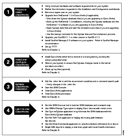 Figure 1-1 provides a visual overview of the tasks explained in this manual, including installation, configuration, validation of installation, and learning to use some simple CiscoWorks applications.