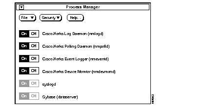 By default, the first four CiscoWorks processes in the window are turned on whenever you reboot your system. These processes run continuously, even if SunNet Manager is not running on your system. To check that the appropriate CiscoWorks processes are turned on, you need to access the Process Manager window.