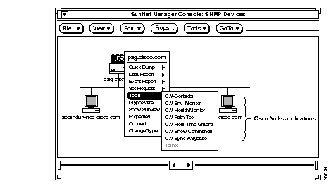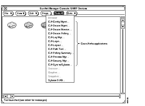 Release 1.0 implements the Cisco Systems strategy to integrate CiscoWorks with the popular SNMP network management platform, SunNet Manager (SNM). CiscoWorks applications appear directly on the SNM Tools and Glyph menus.CiscoWorks uses SNM's map and menu functions.