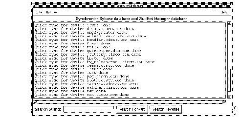 You can stop the synchronization process at any time by selecting Exit from the File menu. The devices that have been synchronized up to this time will be saved in the Sybase database.