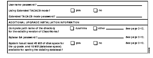 If you are upgrading from an existing version of CiscoWorks, the configuration script prompts you for additional information. Enter this information in the section "Additional Information for an Upgrade Configuration," at the end of the worksheet.