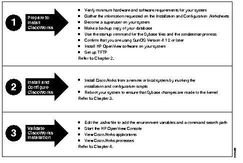 Figure 1-1 provides a visual overview of the tasks explained in this publication, including installation, configuration, validation of installation, and learning to use some simple CiscoWorks applications.