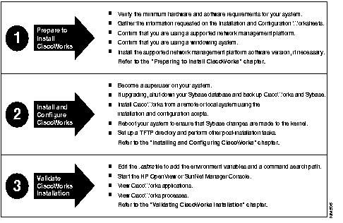 Figure 1-1 provides a visual overview of the tasks necessary for installing CiscoWorks, including preparing to install, installing, configuring, and validating the installation. After reviewing Figure 1-1, you may prefer to perform a quick installation, without completing the installation and configuration worksheets. If so, continue with the next section, "Quick Installation."