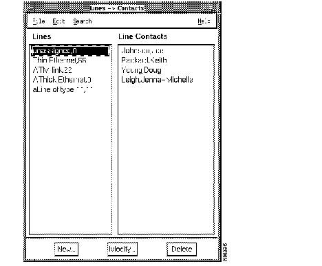 This window enables you to establish and associate contacts to a given line. Line Contacts are individuals who typically have a known expertise in troubleshooting or administration of a given line. A line indicates the transmission cabling in place, such as coaxial cable, fiber-optic cable, or twisted-pair wire.