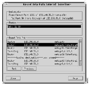 Click on an entry in the Round Trip Path list to highlight that network element's icon and display it's name or address, in the Topology window. Double-click on an entry in the Round Trip Path list to highlight that network element's icon in the Topology window and to open its corresponding Router/LAN Segment/Link Segment/End System configuration window. Within the Round Trip Path list, an informational message "Reached destination - turn around" is displayed. This message signifies when the end point of the path is reached. The subsequent entries in the list denote the components in the return path to the other end point. For SAP, a return path does not exist.