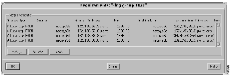 Click on this button to edit the selected connectivity requirement set entry. Depending on the protocol (IP, IPX, or SAP) specified when the requirement set was created, the corresponding Edit IP/IPX/SAP Requirements window is displayed. The entries and fields corresponding to the entry selected in the Requirements window are selected and displayed. Once you have edited the requirements and control has been returned to this window, click on the OK button to apply the edits you made to the requirements file set.