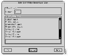 The Edit SAP Filter Interface List window, shown in Figure 10-12, is displayed when you click on the Add button in the SAP Filter Interface List pane in the RIP IPX Algorithm window. This window allows you to create a SAP filter which is then added to the SAP Filter Interface List pane.