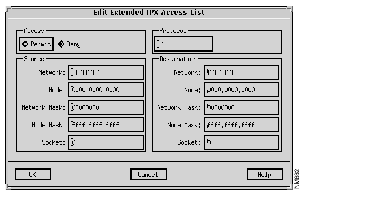 The Edit Extended IPX Access List window, shown in , is displayed when you click on the Add Before, Add After, or Edit buttons in the Extended IPX Access List window. This window allows you to add or modify an extended IPX access list entry. The window's components are described in the following sections. See "General Window Components" for a description of the OK, Cancel, and Help buttons.