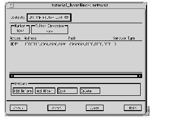 This window's components are described in the following sections. See "General Window Components" for a description of the Context, Add Before, Add After, Edit, Delete, Apply, Revert, Close, and Help buttons. Clicking on the Add Before, Add After, and Edit buttons displays the Edit IPX Standard Network Filter List window. A specific entry in the IPX Network Filter List can be selected prior to clicking on the Add Before, Add After, and Edit buttons. See "Edit IPX Standard Network Filter List Window Components" for a detailed description of the window's components.