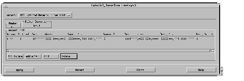 The IPX Routing Table window is displayed when you click on the IPX Routing Table button in the Router Configuration window. The IPX Routing Table window shown in Figure 10-6, displays the IPX Routing Table entries known to the netsys3 router. This table is constructed from the information contained in the baseline router configuration files. Routing Table entries may not be edited from this window. Double-clicking on a Routing Table entry highlights the next hop router in the Topology window.