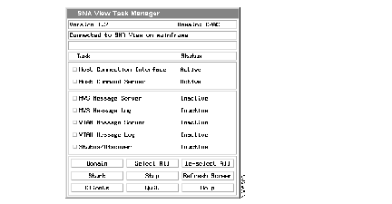 The Task Manager lets you monitor and control the SNA View workstation tasks for each managed SNA domain. Using the Task Manager, you can start and stop the following tasks:
