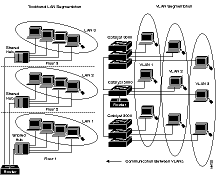 Figure 1-1 shows the difference between LAN and VLAN segmentation.
