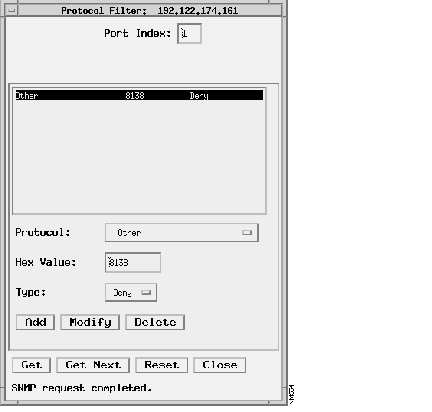 The Protocol Filter window, shown in Figure 7, lets you filter packets based on the Protocol and Type defined in this window. You can define up to a maximum of eight entries per port.