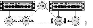 In Figure B-2, two impermeable virtual LANs both include a ring that has servers attached. The first virtual LAN includes rings 001, 002, 101, 201 and 203, and the second includes rings 003, 004, 101 and 203. Broadcast frames are restricted to the list of rings that belong to the virtual LAN and are not forwarded from either virtual LAN onto rings that only belong to the other.