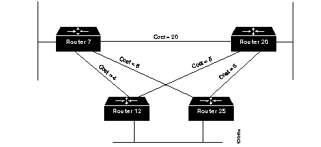 Figure 10 shows four routers (three Ethernets) and the various routes linking them. Each link has a different cost associated with it. The least-expensive route from Router 7 to Router 20 is via Router 12.